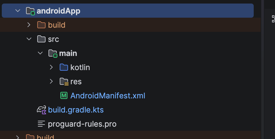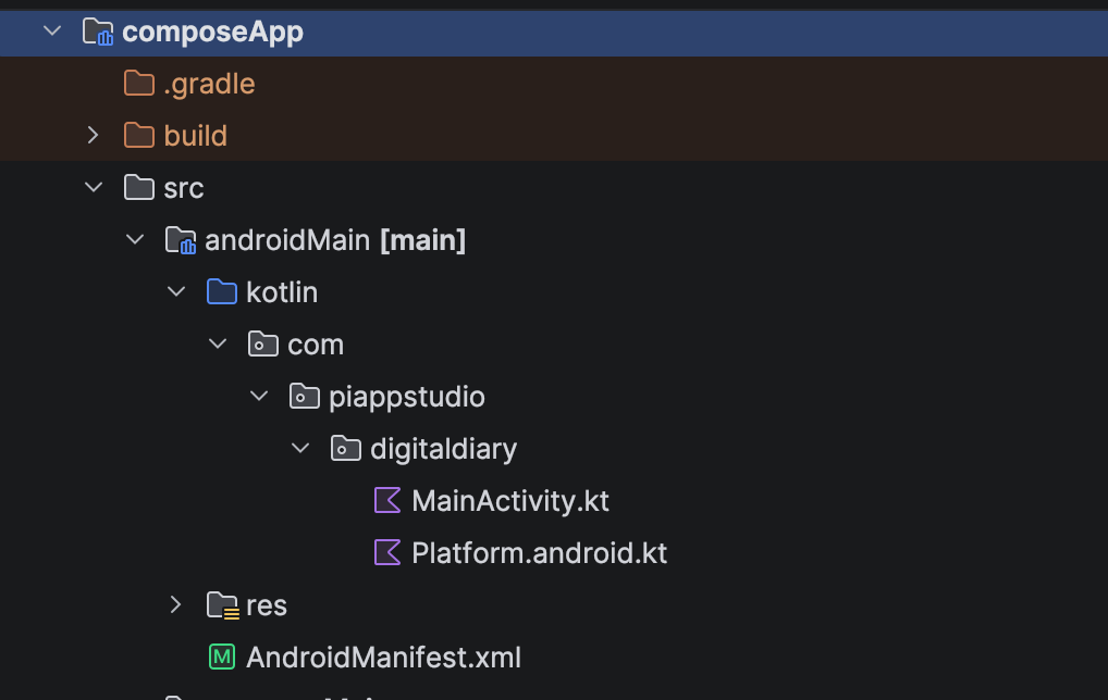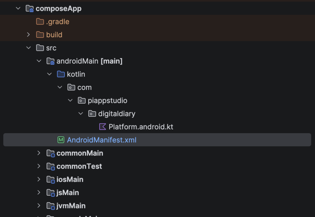 - Create new ‘androidApp/src’ folder and move all the files and folders available in composeApp/src/androidMain to androidApp/src/main except Platform.android.kt file
